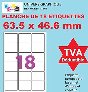 360 étiquettes 63.5 x 46.6 mm Etiquette pour adresse blanches adhésives personnalisables . 360 etiquettes 63,5 x 46,6 mm soit 20 feuilles de 18 étiquettes autocollantes pour imprimante jet d'encre et Impression laser .étiquette utilisable sur word ref UGE18- l7161