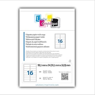 320 étiquettes 99.1 X 33.9 mm étiquettes pour adresse blanches adhésives personnalisables . 320 etiquettes 99,1 X 33,9 mm soit 20 feuilles de 16 étiquettes autocollantes pour imprimante jet d'encre et Impression laser .étiquette utilisable sur word ref UGE016- l7162