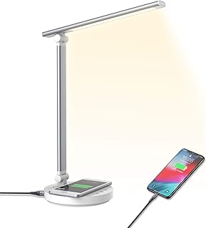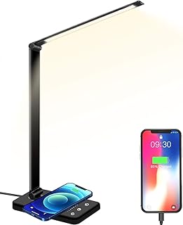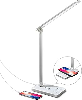 Lampe de Bureau LED, Ainkedin Lampe de Chevet avec Chargeur sans Fil, Lampe Led Dimmable 5 Modes 5 Niveaux de Luminosité, Tactile Protection des Yeux, Port USB/Fonction Minuterie Lampe de Lecture